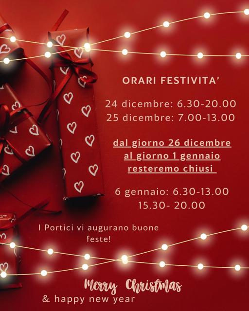 Ciao ragazzi questi sono gli orari del Portici per queste festività, chiuderemo qualche giorno per ricaricarci un pochino e dal 2 gennaio si riparte con tante sorprese 🎉 Buone feste a tutti da tutto lo staff dei Portici ❤️