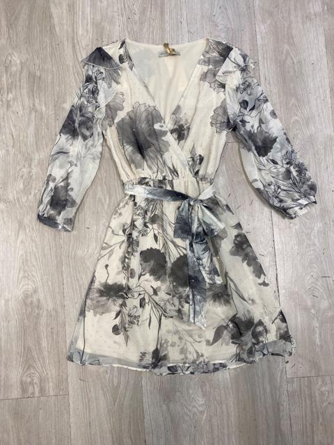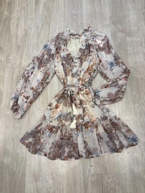 ABITO CON SCOLLO A V E UN FIOCCO AL COLLO CHE PUO ESSERE PORTATO COME CRAVATTINO MANICHE LUNGHE CON POLSINO E GONNA A BALZE. STAMPA MACULATA SUI TONI DEL BEIGE.