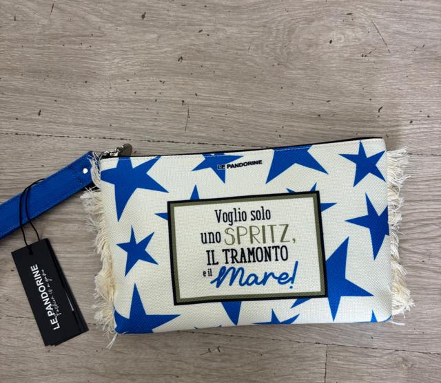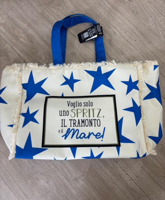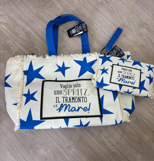 BORSA GRANDE IN TESSUTO CON STELLE BLU E SCRITTA . ABBINA LA POCHETTE NELLO STESSO COLORE.