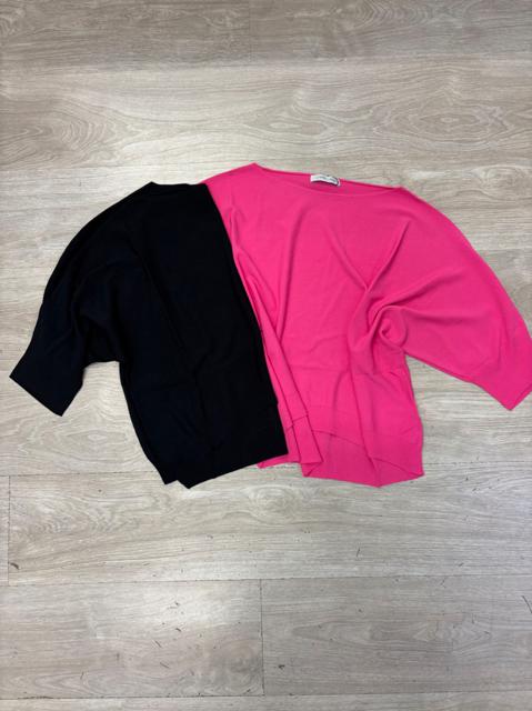 MAGLIONCINO MANICA CORTA CON SCOLLO A BARCHETTA E SPACCHI LATERALI, LEGGERMENTE PIU LUNGO DIETRO.