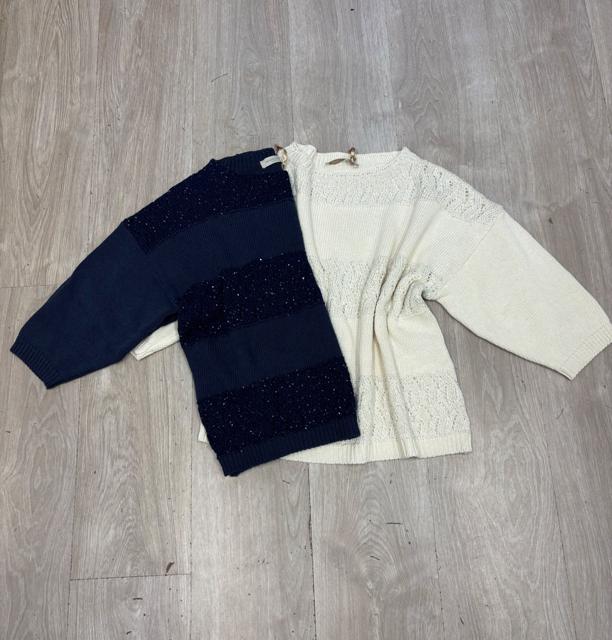 MAGLIONCINO GIROCOLLO MANICA A 3/4 IN MORBIDO TESSUTO MISTO COTONE. DETTAGLI TRAFORATI CON APPLICAZIONE DI PAILLETTES.