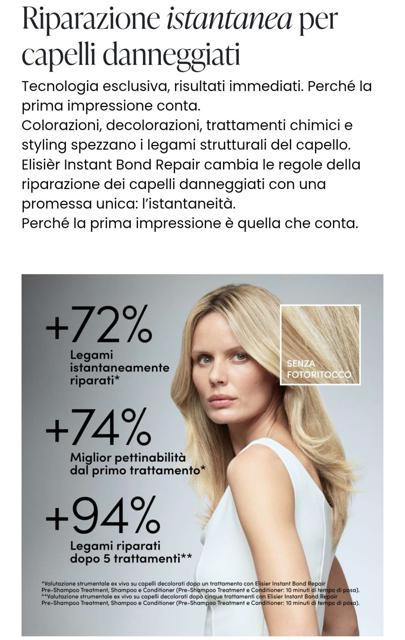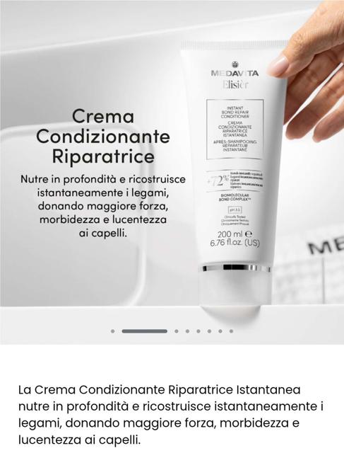 Tre anni di ricerca per un esclusivo complesso di princii attivi - aminoacidi, polipeptidi del riso e acido ialuronico che penetra in profondità per riparare i legami disolfuro del capello