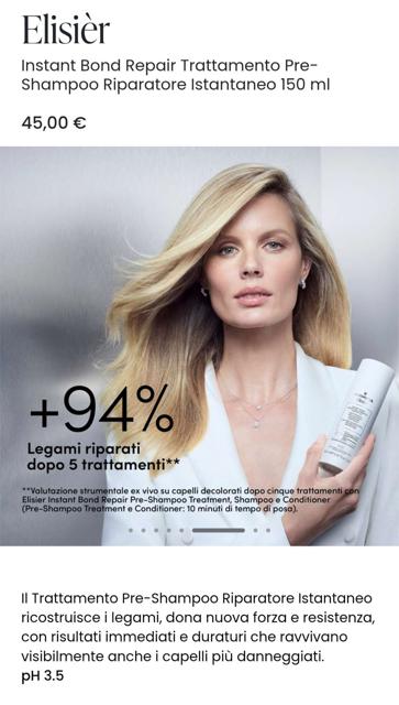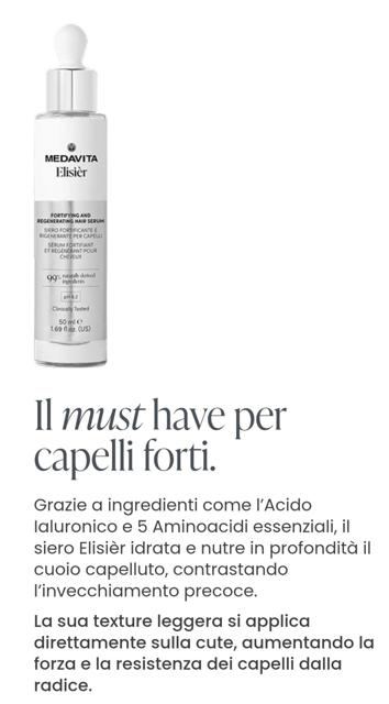 grazie a ingredienti come l'Acido aluronico e 5 Aminoacidi essenziali, il siero Elisièr idrata e nutre in profondità il cuoio capelluto, contrastando l'invecchiamento precoce.