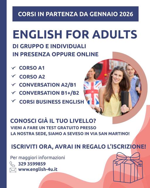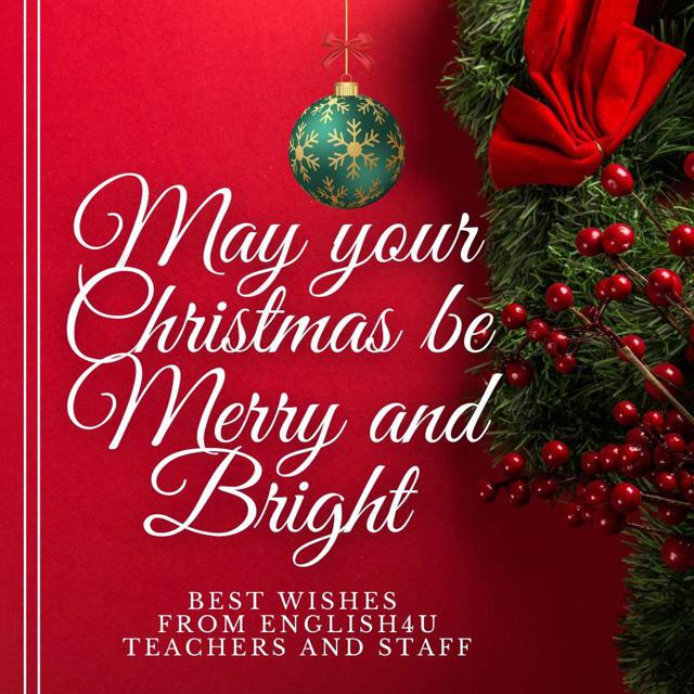 Carissimi genitori e studenti, vogliamo ringraziarvi per la fiducia che da anni riponete in noi, ci piace considerarvi tutti parte della nostra grande famiglia English4U. Auguriamo a tutti voi un Sereno Natale con i vostri cari e un prospero Buon Anno. 🎄🎅✨ Per ricaricare le batterie, la nostra scuola rimarrà chiusa dal 23 Dicembre al 6 Gennaio 2026. Tutti i corsi riprenderanno regolarmente il 7 gennaio 2026. 😊 May your Christmas be merry and bright! ✨ Erika e tutto lo staff di English4U
